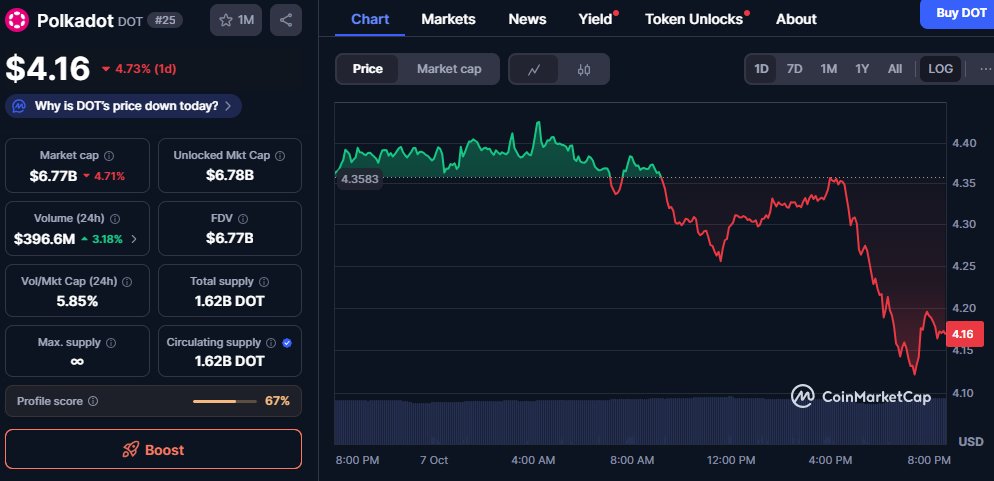 波卡(DOT)下跌4.73%至4.16美元,市值降至67.8亿美元。交易量逆势增长3.18%至3.966亿美元,显示价格回调中市场参与度仍然活跃。该资产日内持续走低,反映4.35美元阻力位附近的短期抛售集中。
