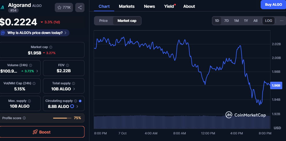 Algorand(ALGO)下跌3.3%至0.2224美元,市值降至19.5亿美元。交易量微增3.72%至1.009亿美元,反映参与者持续参与。尽管早盘遭遇阻力,ALGO全天保持相对稳定的流动性。