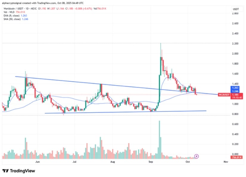 分析师Alpha Crypto Signal在最新推文中分享了对该模因币的见解,强调代币在将长期下降趋势线转化为支撑位后,目前正在对突破区域进行重测。推文指出WLD正处于指数移动平均线(EMA)与突破线的交汇处,这种技术形态通常预示着健康的重测阶段。