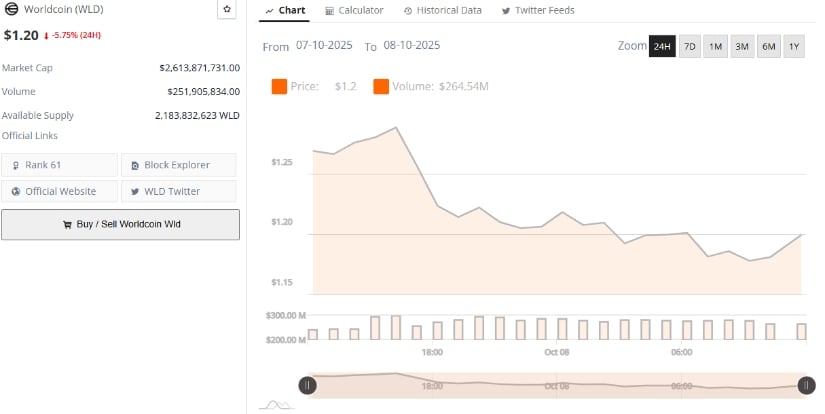 BraveNewCoin数据显示,Worldcoin当前市值超26亿美元,日交易量突破2.5亿美元,表明尽管近期波动剧烈,市场参与度仍然活跃。