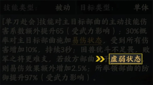 应用场景:易伤效果能提升集火收益与技能联动的效率(如程昱多段伤害),非常适配大多需要高爆发压制的部曲,战场中可以给需要集火的敌方部曲施加易伤效果,来更快的实现减员。