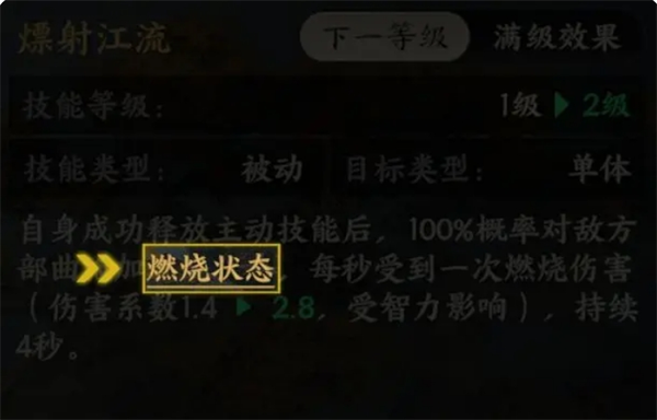 特性收益:鲁肃有概率对燃烧部曲施加易伤,小乔或吕蒙对燃烧状态的目标伤害提升