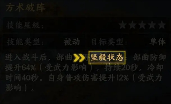 【坚毅状态】:在坚毅状态期间,部曲防御提升,有时间冷却。