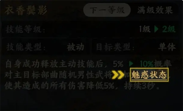 【魅惑状态】:在魅惑状态期间,敌方武将造成的所有伤害降低