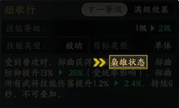 【枭雄状态】:在枭雄状态期间,部曲防御提升,部曲所有武将技能伤害提升