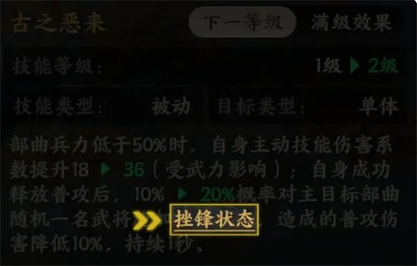 【挫锋状态】:在挫锋状态期间,敌方武将造成的所有普攻伤害降低