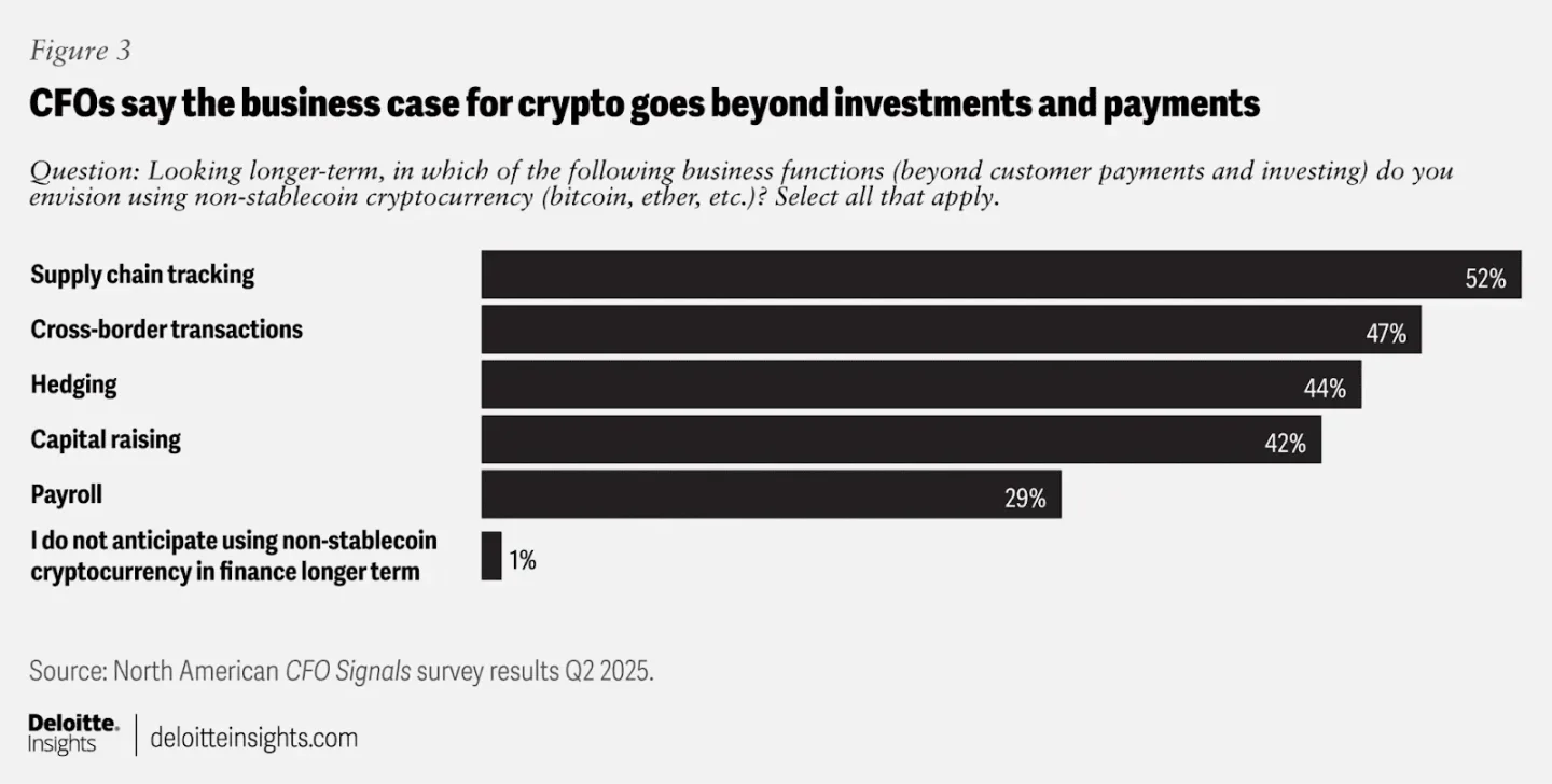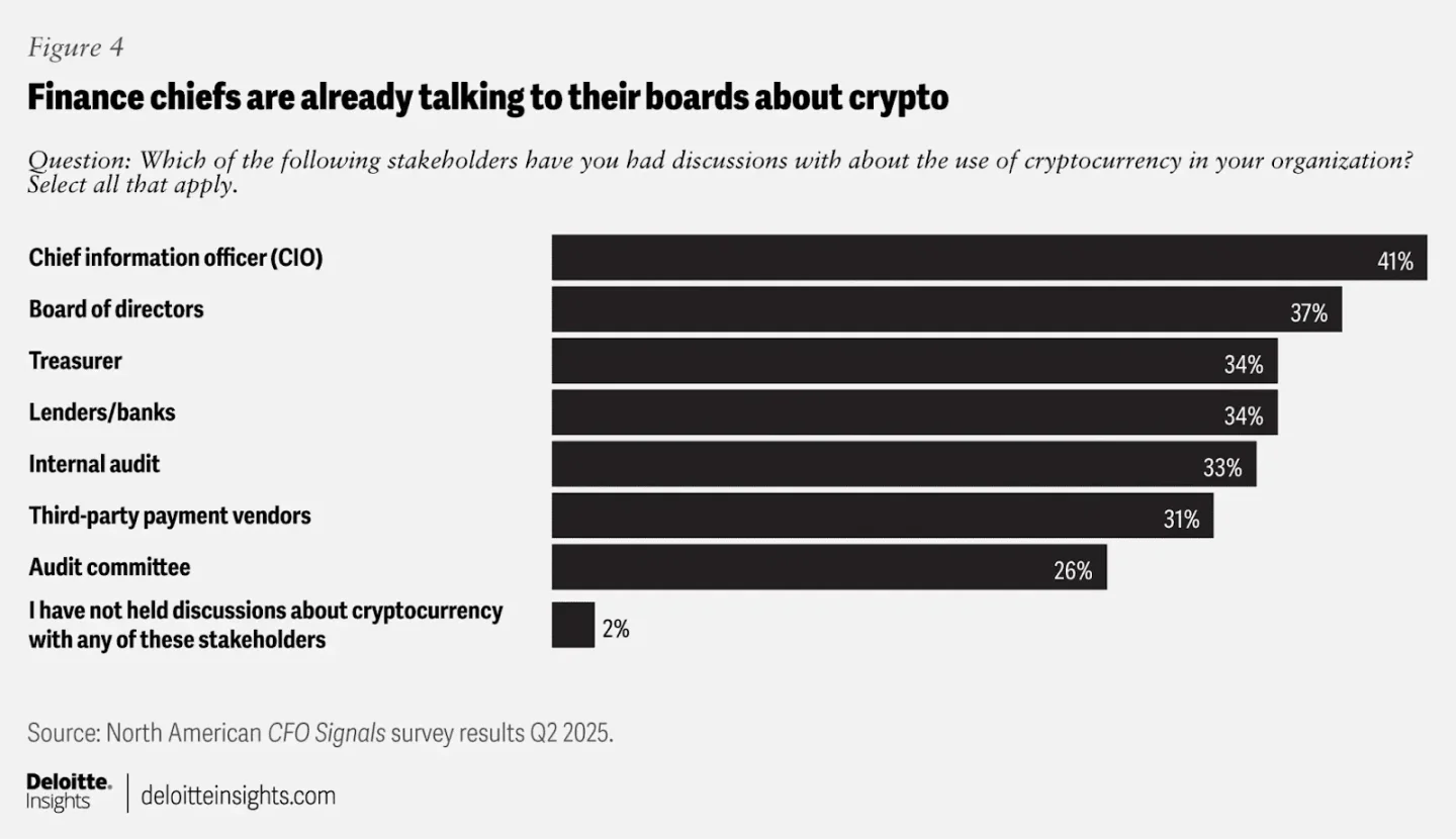 德勤在 7 月份发布的一项调查,就代币化对 200 位营收至少 10 亿美元公司的财务长进行了民意调查。调查显示,几乎所有财务长都期望「长期使用加密货币用于业务功能」。只有 1% 的受访者表示他们没有设想过这一点。23% 的受访者表示,他们的资金部门「将在未来两年内将加密货币用于投资或支付」,对于营收在 100 亿美元或以上的机构的财务长来说,这一比例接近 40%。此外,在这些受访者中,只有「2% 的受访者表示他们没有与关键利益相关者就加密货币进行过任何对话」。