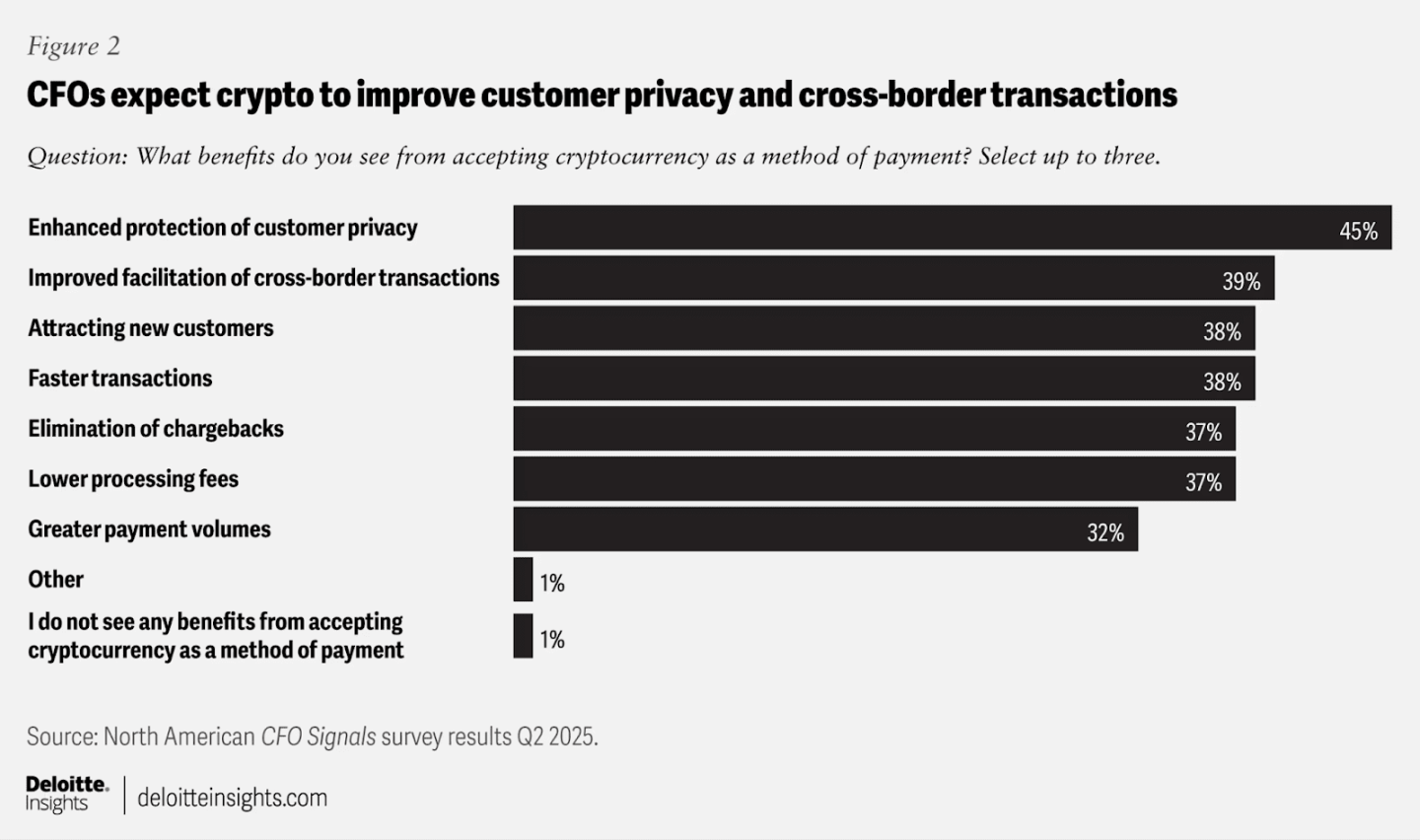当被问及「接受加密货币作为支付方式」的好处时,财务长们将增强客户隐私列为最有价值的优势,他们认识到客户资料收集对用户隐私造成的巨大损害。