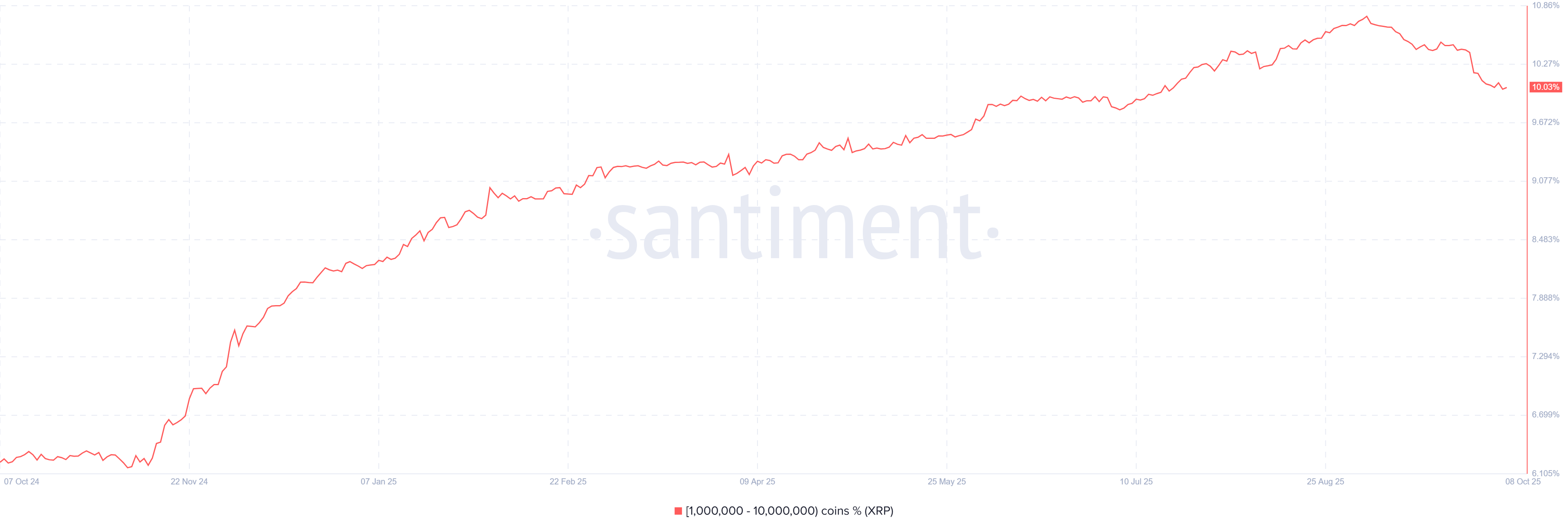 该群体持币占比从2024年10月的6%攀升至2025年9月10.76%峰值,随后在2025年10月初回落至10%。