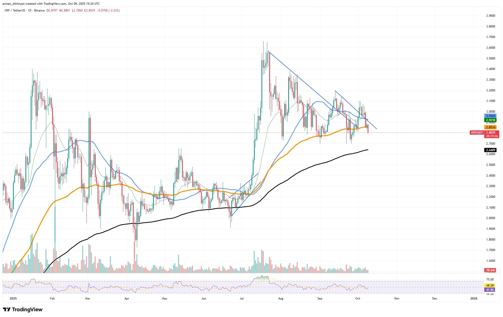 过去24小时XRP跌幅超2.5%,接连跌破短期趋势线与100日均线支撑,现报2.80美元附近。此前在2.85-2.87美元区间起稳定作用的均线,现已转化为阻力位。历史数据显示,类似破位往往引发剧烈抛售,特别是当伴随成交量萎缩和动能衰退时——当前XRP技术形态正同时呈现这两大危险信号。