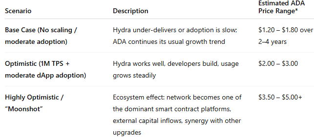基于此预期,我们调取ChatGPT与Gemini两大AI模型,推演Hydra在Cardano主网实现百万TPS并加速dApp增长情境下的ADA价格走势。