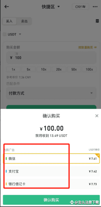 选择要购入的数字货币。使用筛选条件即可筛选出所有的C2C广告。例如,使用100欧元购买USDT。点击心仪出价旁边的【购买】即可。
