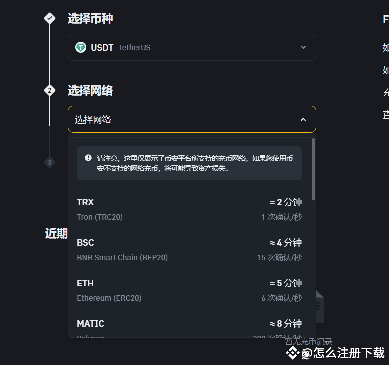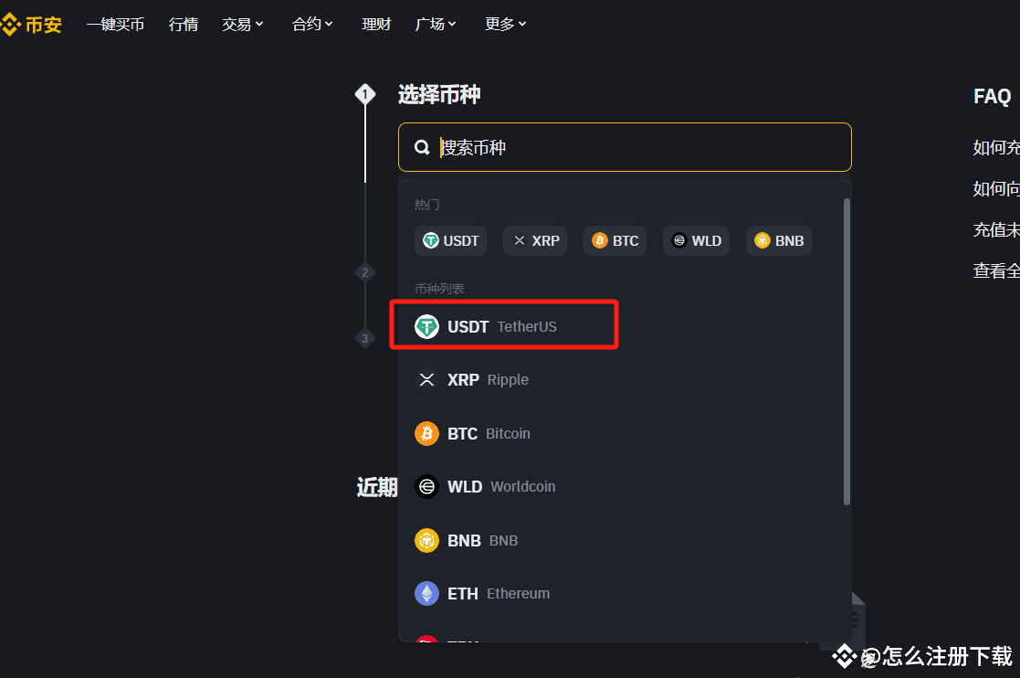 3.选择需要充值的币种,比如需要充值usdt,可以选择usdt