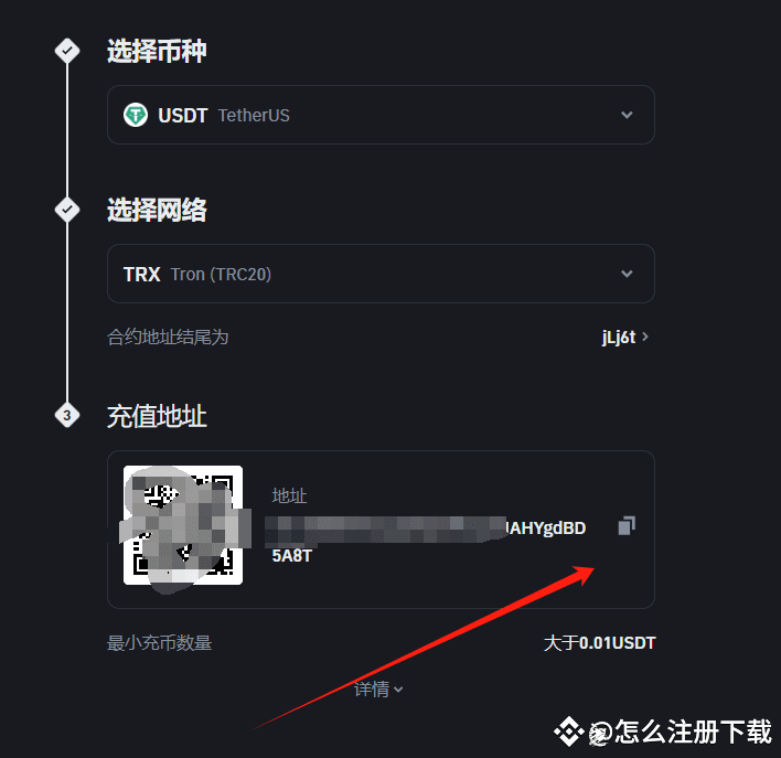 确定好充值的币种与网络之后,点击复制地址发送给对方