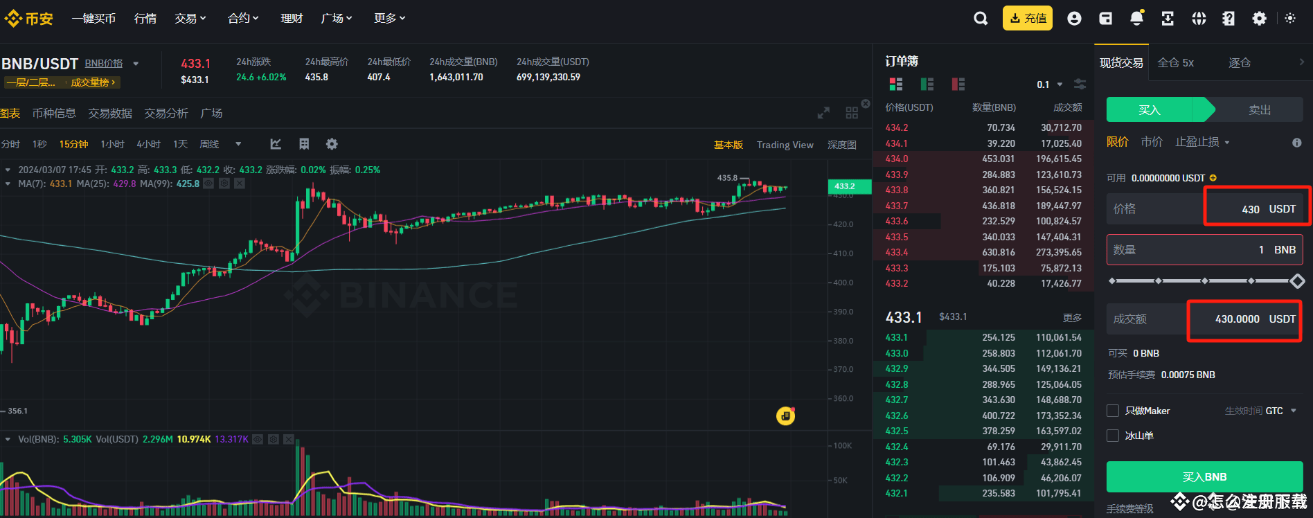 比如上方截图,用430u的价格买入一个bnb,这时候需要支付430u。