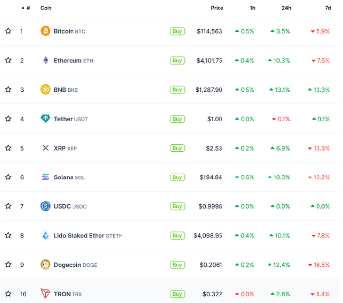 经历血洗160万交易者、蒸发8000亿市值的暴跌后,$ETH、$BNB与$DOGE现领涨反弹。随着比特币10月11日下探后迅速突破11.5万美元,市场已全面翻红。