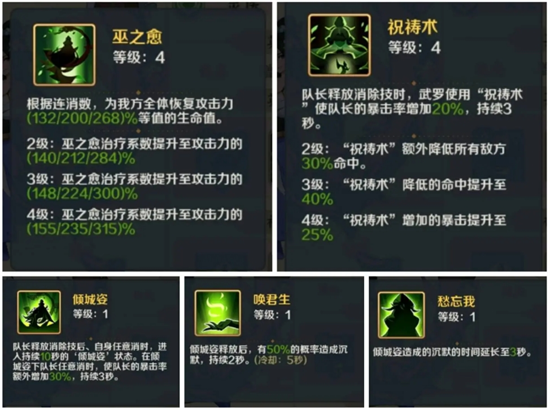 消除技全队回血,核心技和神兵技能提高队长暴击率、降低敌方命中并提供沉默控制。能保证核心输出持续作战,同时提供团队控制和增益。