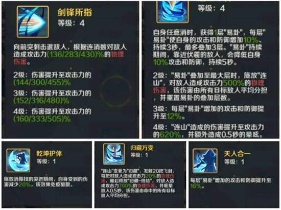 消除叠加“易卦”,提升自身攻防并削弱周围敌人攻击防御。满层触发“连山/归藏”,造成群体物理伤害并眩晕。神兵技能进一步放大群伤和控制效果。