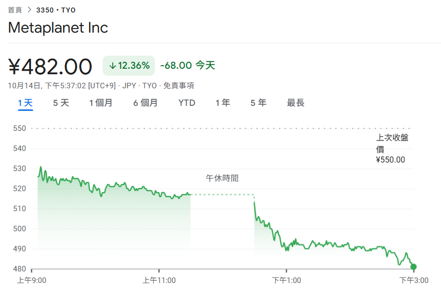 据谷歌财经数据显示,Metaplanet 自 2024 年 4 月宣布效仿微策略(Strategy),将比特币纳入其核心资产后,一度被视为「日版微策略」。随着比特币此前持续走高,Metaplanet 的股票也不断上涨,并在今年 6 月中旬创下 1,895 日圆的历史新高。然而好景不长,Metaplanet 股票新高后就持续走低,今日最低时已经跌至 480 日圆,显示卖压沉重。