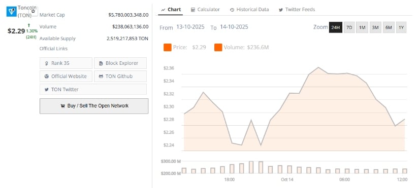Toncoin现价2.29美元,24小时涨幅1.30%。来源:Brave New Coin