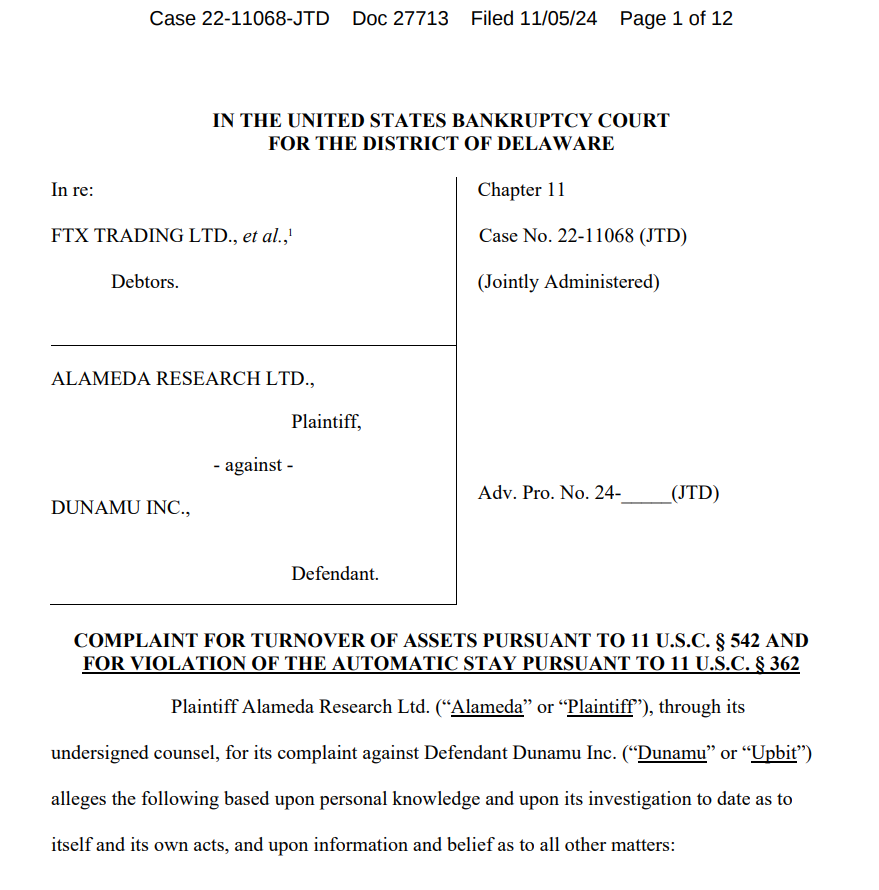 这起诉讼作为FTX破产程序的一部分,由FTX子公司Alameda Research于2024年11月5日向美国特拉华州破产法院提交,目前案件仍在审理中。