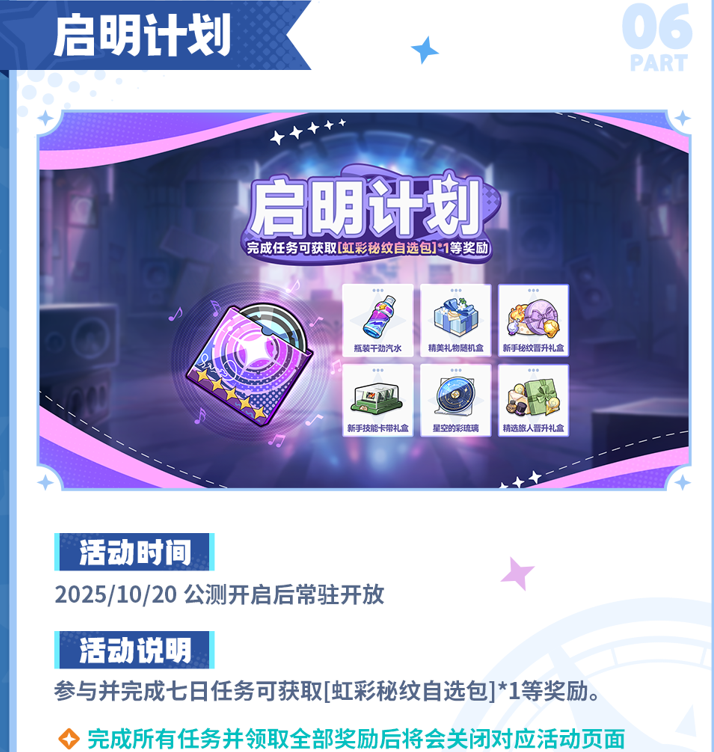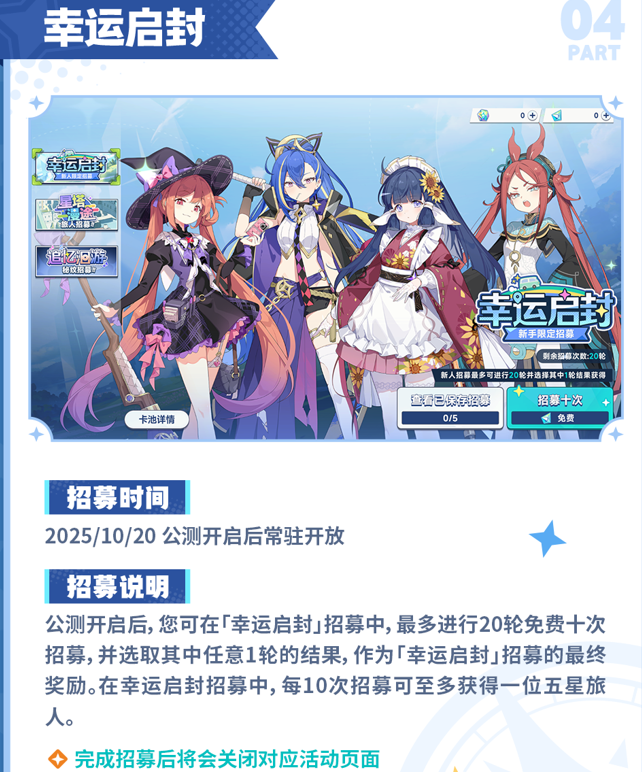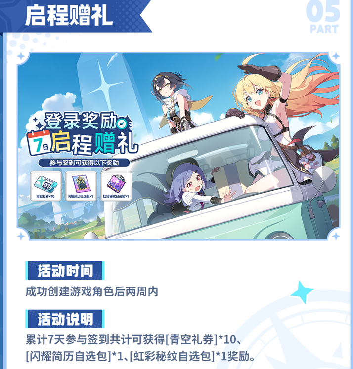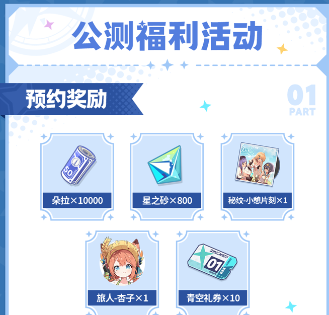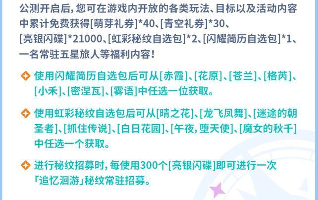 公测开启后,魔王大人可通过体验游戏获得[萌芽礼券]*40、[青空礼券]*30、[亮银闪碟]*21000、[虹彩秘纹自选包]*2、[闪耀简历自选包]*1、一名常驻五星旅人等福利内容!查看图片可了解福利内容详情~