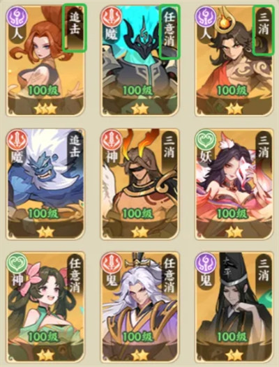 为了避免三消型英雄互相“抢块”,在搭配阵容时,要尽量避免出现两个三消型英雄同时上阵;
