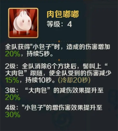 但她的核心技【肉包嘟嘟】仅需消除自己的任意方块就可以触发,不受其他限制,换而言之,每次消除都可以为血量最低的队友回复高额生命值并提高他的攻击力。