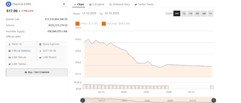 Chainlink目前交易于关键支撑区间附近,分析师预测若该区域持稳或将引发趋势反转。该加密货币现报17.96美元,过去24小时下跌5.7%,在整体市场疲软背景下遭遇显著抛压。近期价格走势反映出持续获利了结,该资产在两天内从19.20美元跌至18美元下方。