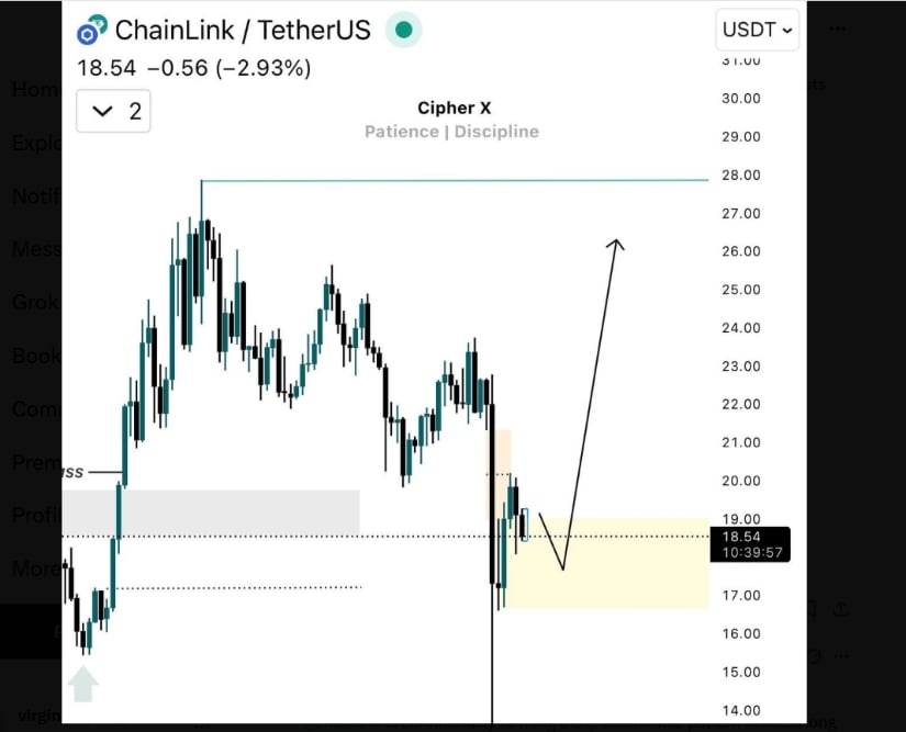 分析师Cipher X预期代币将在持续反弹前重新测试17-18美元支撑区。该分析师将此区域描述为潜在吸筹区,价格稳定可能为更大级别反弹奠定基础。其分享的图表显示资产正在该区间内交易,可能出现小幅下探后向25-28美元区域反弹的走势。