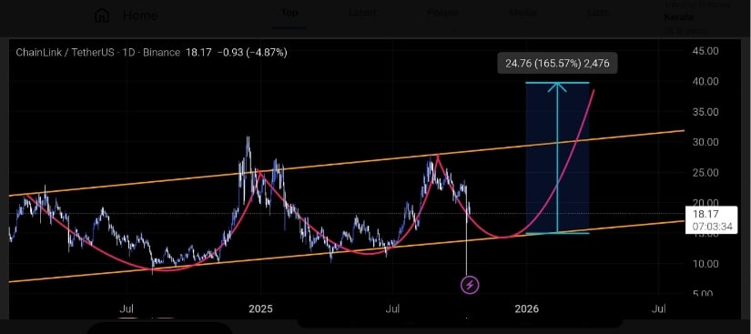 Cipher X和CryptoLycus指出LINK在长期上升通道内正形成吸筹模式与看涨结构,表明守住该关键支撑位可能触发价格动能进入下一轮突破阶段。