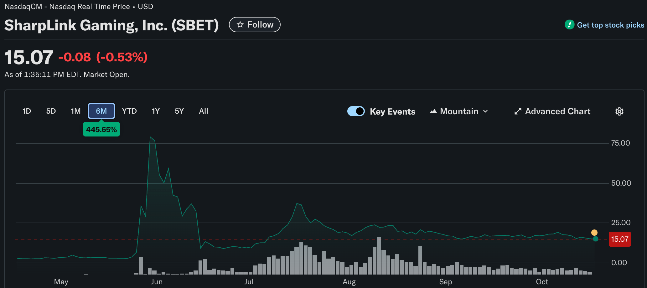 公告发布后,SharpLink股价微跌至15.07美元(截至发稿)。但受ETH价格上涨推动,该股过去六个月累计涨幅高达445%。