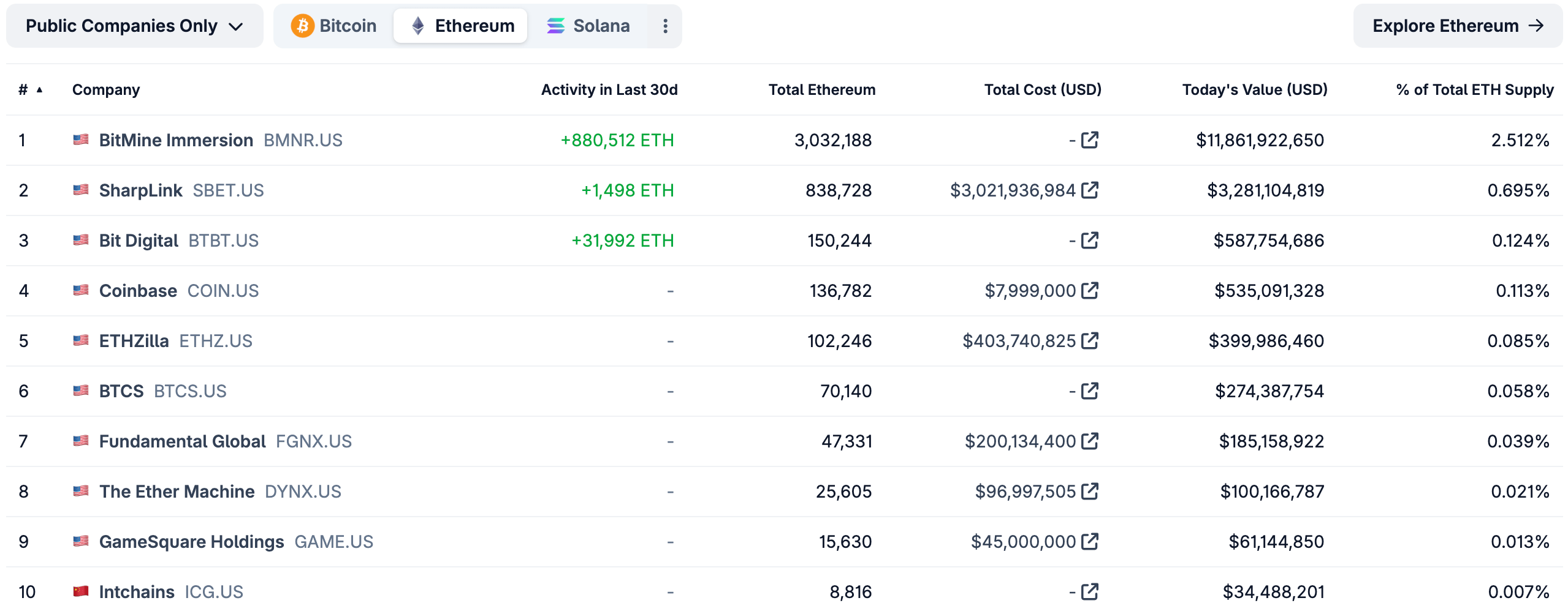 据Coingecko数据,SharpLink当前以太坊持仓量在上市公司中位列第二。BitMine Technologies仍以超300万枚ETH的持仓量稳居榜首。