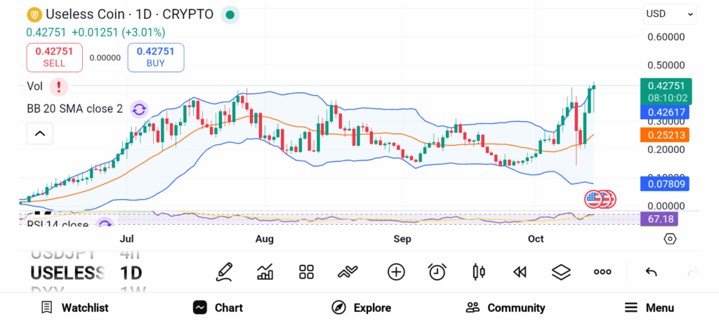 Useless Coin在周五市场崩盘后意外上演逆袭故事。该代币现报0.368美元,仅较历史高点0.444美元下跌19.7%。当大多数山寨币仍在艰难收复半数失地时,这一表现令人瞩目。0.364美元已成为关键支撑区,该价位与50日指数移动平均线重合,形成买盘的可靠防线。若支撑持续稳固,代币可能快速回升至0.444美元。如此走势彰显日益增强的投资者信心。在技术结构支持突破的情况下,USELESS或将很快再创新高。