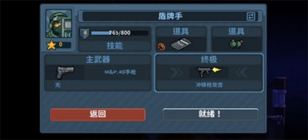 使用武器为手枪,属于全角色最烂武器。而且盾牌耐久需要靠防弹衣补给维修 很耗补给。前期过渡关卡可能方便玩玩,后期太容易被刀手和自爆手贴脸 没办法小手枪威力和射速太小了 人家冲过来属实打不死。