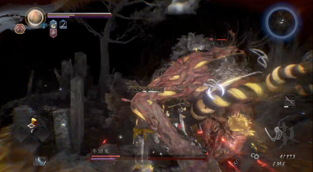 在武器选择方面,长枪是较为合适的选择,尤其推荐使用上段架势。上段普通攻击距离较远,可较为安全地进行蹭刀,且其削精效果优于中段与下段,对快速清空牛头鬼的精力条极为关键。作战时可保持一定距离,躲避攻击后迅速靠近以上段轻击连戳,再适时后撤准备应对下一招。此外,还可利用场地环境——例如起始位置附近有一道水门,牛头鬼在发动冲击时有可能受其阻碍,玩家可趁机绕至其身后进行输出。