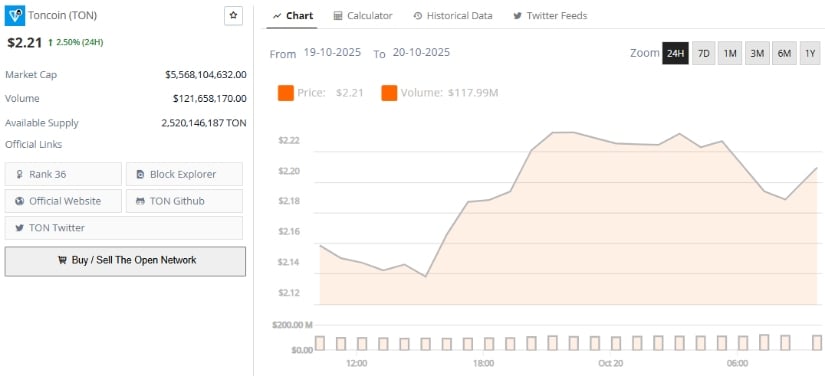 截至发稿时,Toncoin交易价格约2.21美元,24小时涨幅2.50%。来源:Brave New Coin