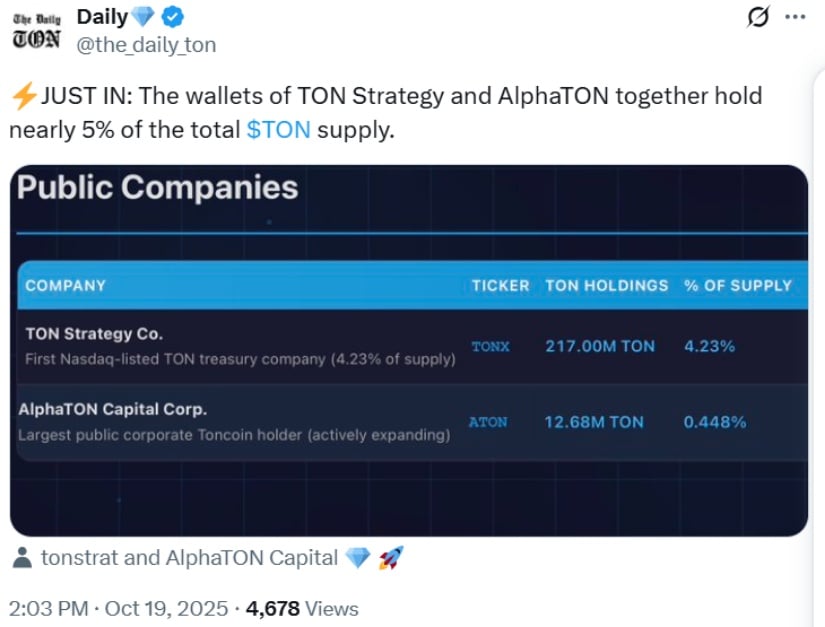 TON Strategy与AlphaTON合计持有近5%的Toncoin(TON)流通量,表明显著的机构积累与市场影响力。来源:Daily via X