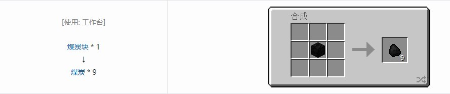 可用于作为熔炉的燃料使用,一块煤炭在熔炉中可以燃烧 80 秒(8 个物品),给动力矿车提供 4 分钟的动力。