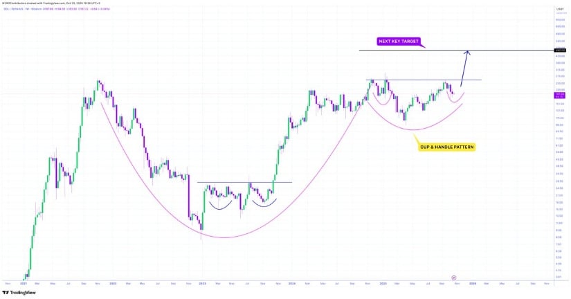 Solana正在形成罕见的多年杯柄形态叠加反向头肩,暗示可能突破至480美元。来源:CryptoWZRD/X