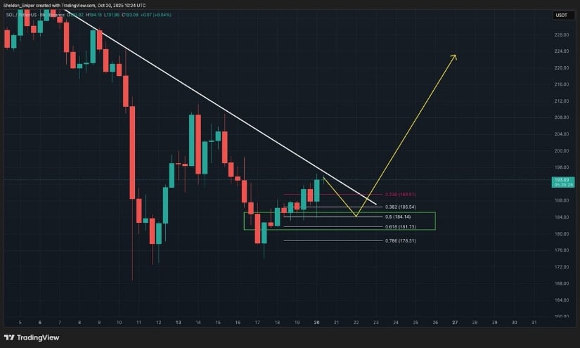狙击手Sheldon指出,Solana在180-185美元区间反弹后刚形成更高低点结构,确认短期上升趋势强度。10月初以来的下降趋势线阻力现成为主要障碍,该阻力位恰位于200美元下方。