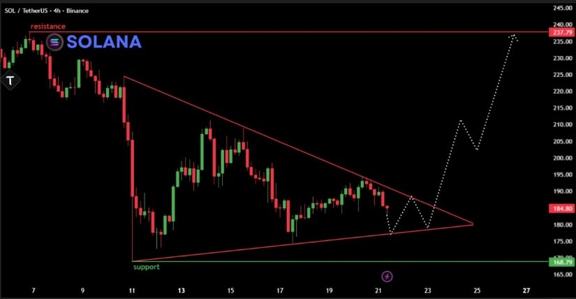Solana价格在对称三角形内持续收紧,市场参与者正关注237.8美元上方的突破机会,潜在目标260美元。来源:NekoZ/X