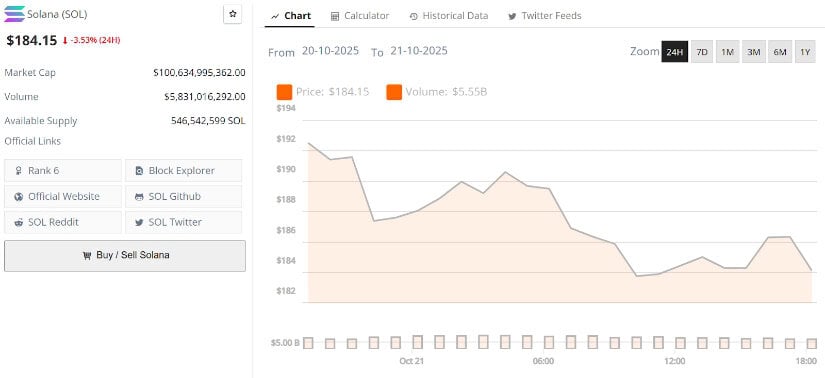 Solana现价184.15美元,24小时跌幅3.53%。来源:Brave New Coin