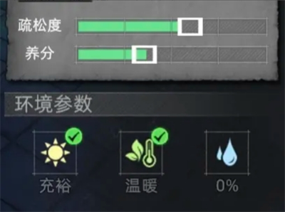 这里放「泥土」是因为它的疏松度和营养进度条是一致的方便调节,而且不算低在 20% 左右,这里就不放图了,大家自己游戏里看。