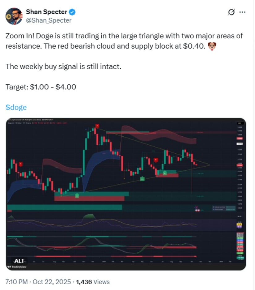 狗狗币仍处于大型三角形态内,周线买入信号保持有效,当前面临0.40美元关键阻力,目标区间1-4美元。来源:Shan Specter via X