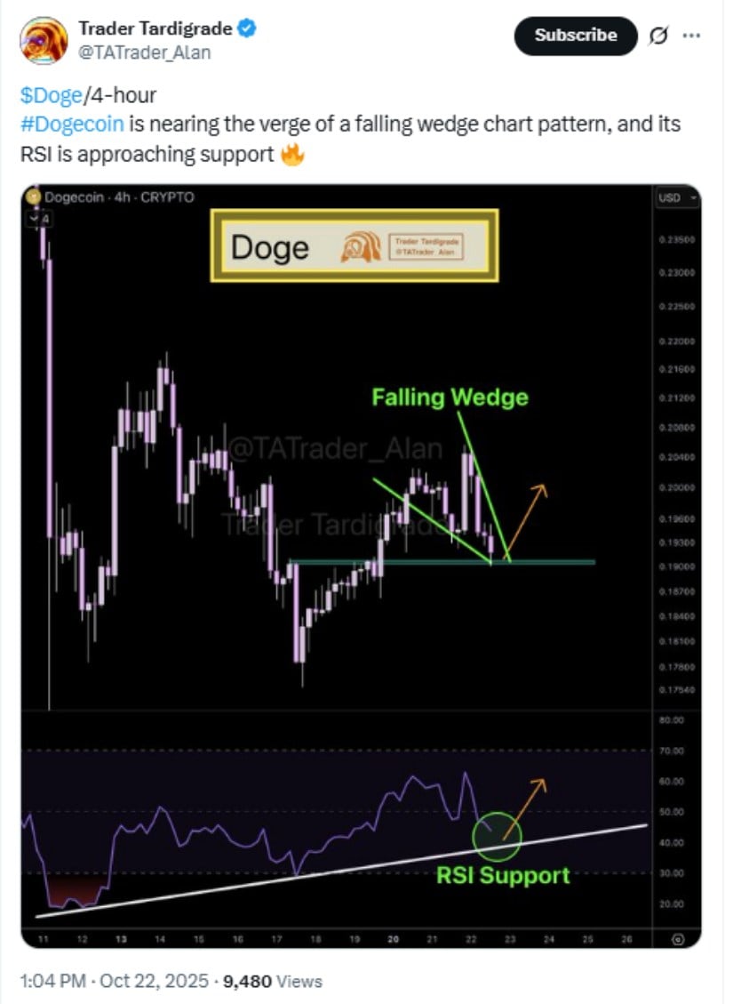 DOGE 4小时图显示价格接近下降楔形形态,RSI逼近关键支撑。来源:Trader Tardigrade via X