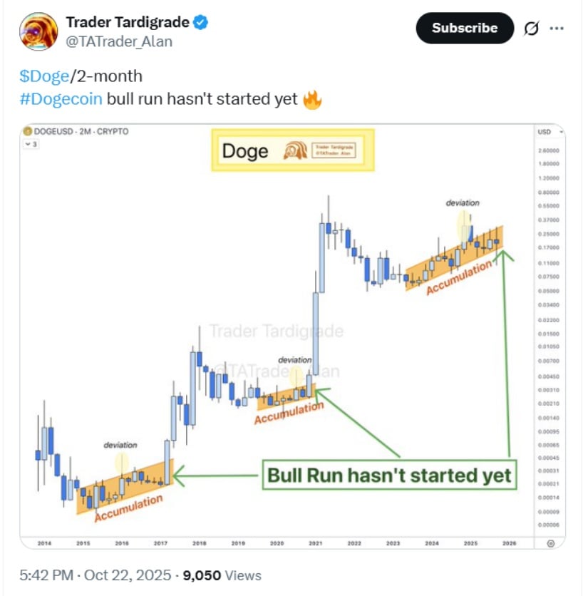 DOGE 2个月图表显示狗狗币牛市尚未启动。来源:Trader Tardigrade via X