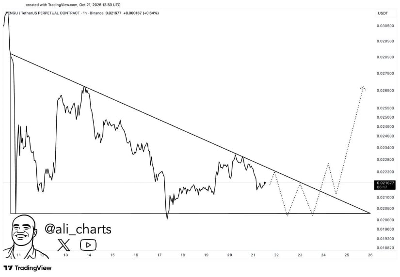 PENGU形成具有突破潜力的紧缩结构,预示着可能向0.027美元上涨30%。来源:Ali Martinez via X