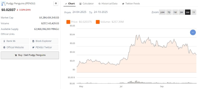 Pudgy Penguins当前价格为0.02037美元,过去24小时下跌-3.32%。来源:Brave New Coin