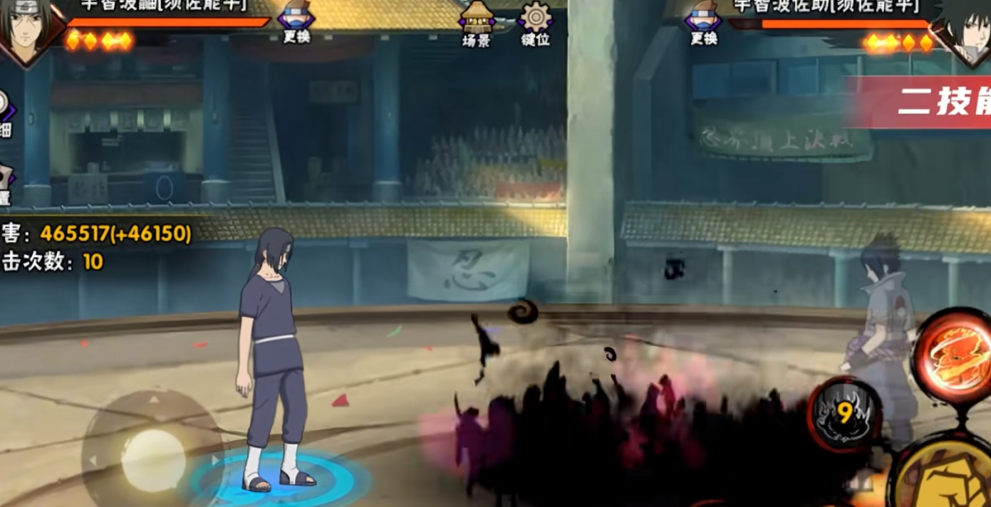须佐鼬的普攻分为多段,前两段攻击可击退敌人,第三段将目标击飞,最后一段则向前喷吐火遁。第二段攻击无法通过摇杆转向,但可借助密卷调整方向。该段攻击Y轴范围较大,且带有减帧效果,可在对方释放技能时用于规避伤害。第三段攻击能无视倒地状态,直接将倒地目标击飞。跳起时无法取消攻击后摇,但后段攻击同样可通过密卷转向。